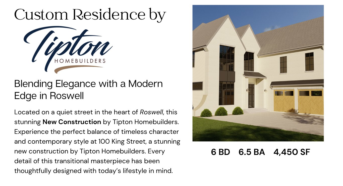 Discover 100 King Street in Roswell, a new Tipton Homebuilders residence showcasing refined transitional design in Atlanta. This 6 bedroom 6.5 bathroom home features a chef’s kitchen, spa-like primary suite, custom finishes, and a functional mudroom with storage, this home blends timeless character with modern luxury.