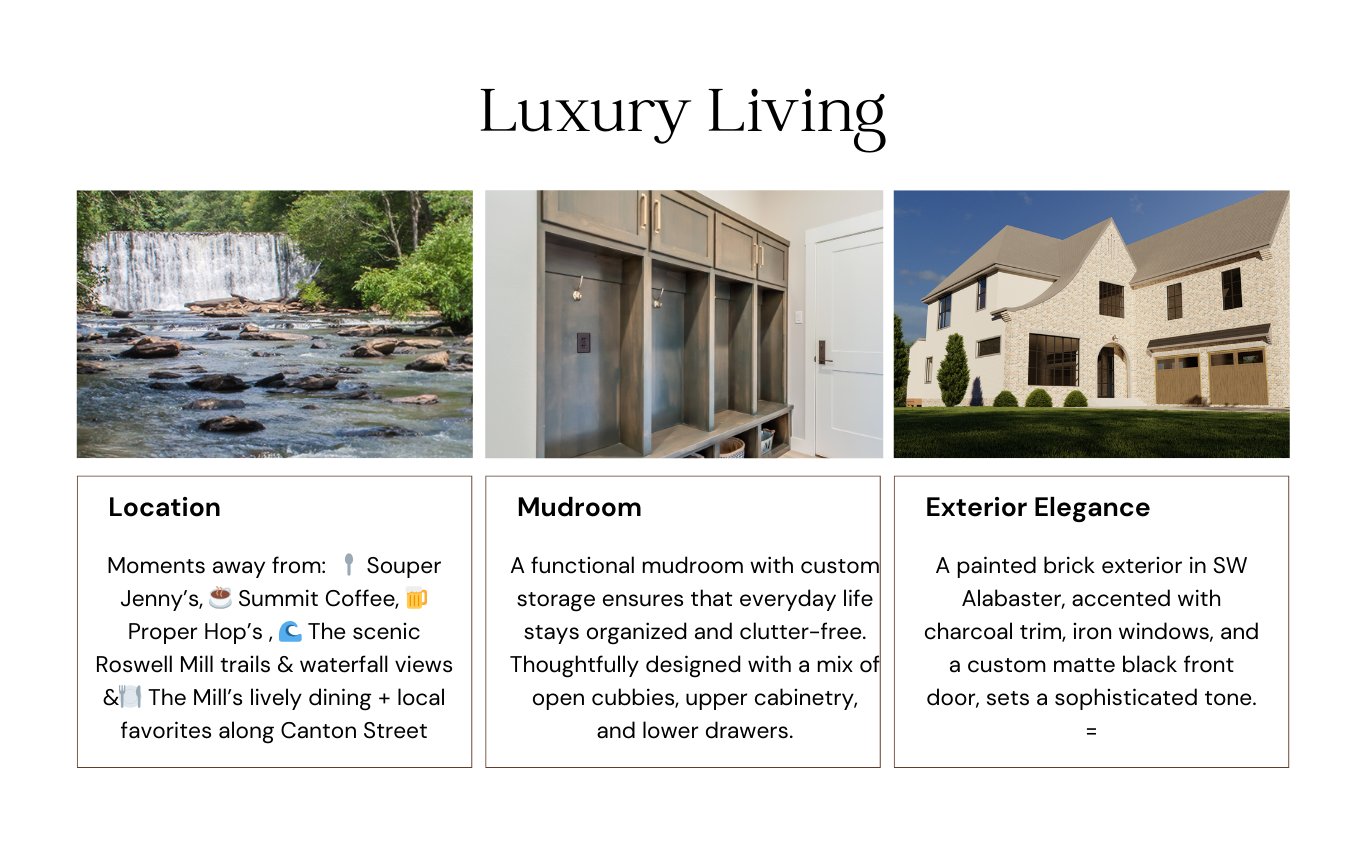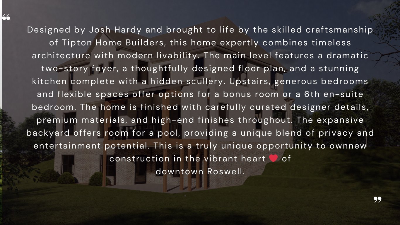 Designed by Josh Hardy and built by Tipton Home Builders, these homes blend timeless architecture with modern livability. Inside, you’ll find a dramatic two-story foyer, stunning kitchen with hidden scullery, and flexible upstairs spaces that can serve as a bonus room or 6th en-suite bedroom. Finished with curated designer details and premium materials, each home also features an expansive backyard with room for a pool — the perfect mix of privacy and entertainment. A rare chance to own new construction in the heart ❤️ of downtown Roswell.