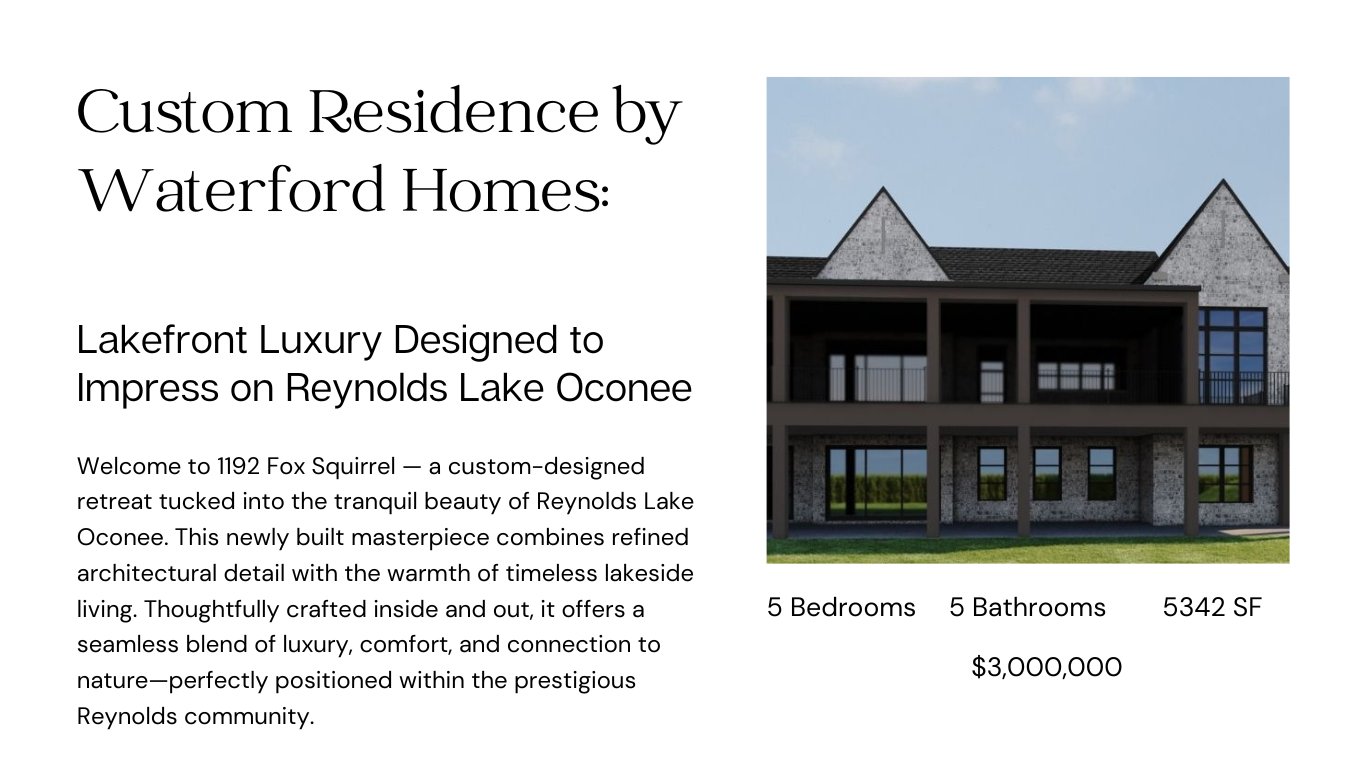 Welcome to 1192 Fox Squirrel — a custom-designed retreat tucked into the tranquil beauty of Reynolds Lake Oconee. This newly built masterpiece combines refined architectural detail with the warmth of timeless lakeside living. Thoughtfully crafted inside and out, it offers a seamless blend of luxury, comfort, and connection to nature—perfectly positioned within the prestigious Reynolds community.